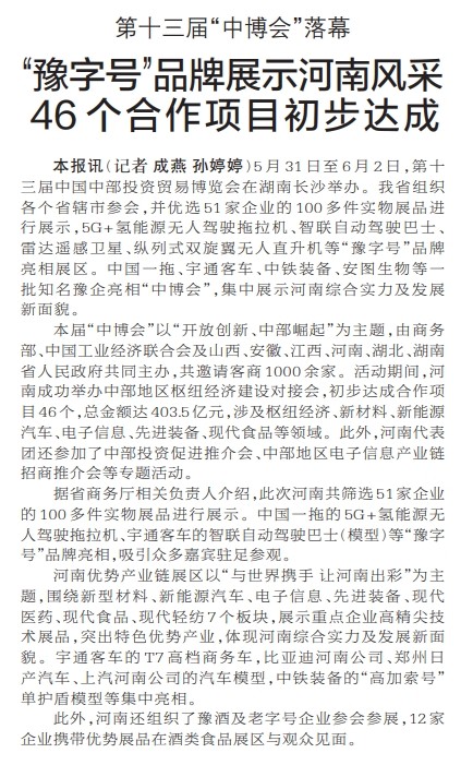 5月31日至6月2日,第十三届中国中部投资贸易博览会在湖南长沙举办。我省组织各个省辖市参会,并优选51家企业的100多件实物展品进行展示,5G+氢能源无人驾驶拖拉机、智联自动驾驶巴士、雷达遥感卫星、纵列式双旋翼无人直升机等“豫字号”品牌亮相展区。中国一拖、宇通客车、中铁装备、安图生物等一批知名豫企亮相“中博会”,集中展示河南综合实力及发展新面貌。(今日《郑州日报》1版)