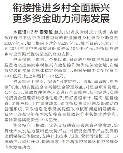 记者从省财政厅获悉,省财政厅近日下达中央和省级财政衔接推进乡村振兴补助资金20.07亿元,加上提前下达的85.38亿元,截至目前,已累计下达2024年度中央和省级衔接资金105.45亿元,为衔接推进乡村全面振兴提供坚实的财力支撑。(今日《郑州日报》1版)
