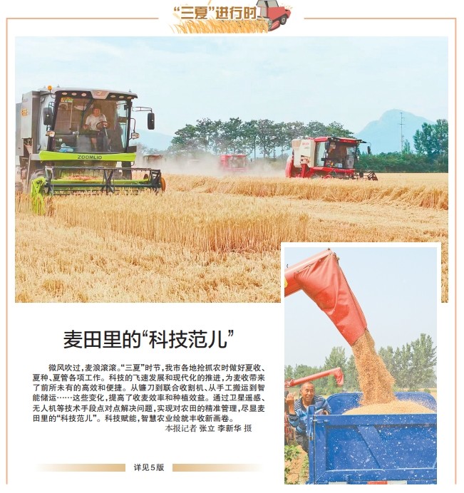 微风吹过,麦浪滚滚。“三夏”时节,我市各地抢抓农时做好夏收、夏种、夏管各项工作。科技的飞速发展和现代化的推进,为麦收带来了前所未有的高效和便捷。从镰刀到联合收割机、从手工搬运到智能储运……这些变化,提高了收麦效率和种植效益。通过卫星遥感、无人机等技术手段点对点解决问题,实现对农田的精准管理,尽显麦田里的“科技范儿”。科技赋能,智慧农业绘就丰收新画卷。(今日《郑州日报》1版、5版)
