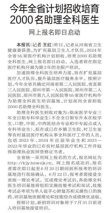 昨日,记者从河南省卫生健康委获悉,为扩充基层卫生人才队伍,2024年全省55家医疗机构计划招收、培育2000名助理全科医生,网上报名即日启动。入选者将在指定医疗机构开展为期2年的全脱产培训。(今日《郑州日报》1版)
