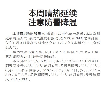 记者昨日从市气象台获悉,本周郑州延续晴热天气,最高气温稍有波动,在31℃和34℃之间徘徊,仅在6月9日最高气温或将突破35℃,迎来本周唯一一次高温天气。(今日《郑州日报》1版)