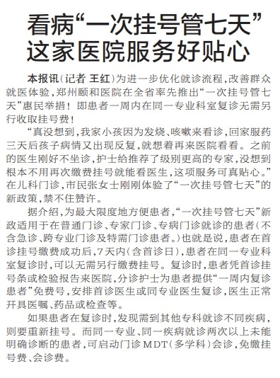为进一步优化就诊流程,改善群众就医体验,郑州颐和医院在全省率先推出“一次挂号管七天”惠民举措!即患者一周内在同一专业科室复诊无需另行收取挂号费!(今日《郑州日报》2版)