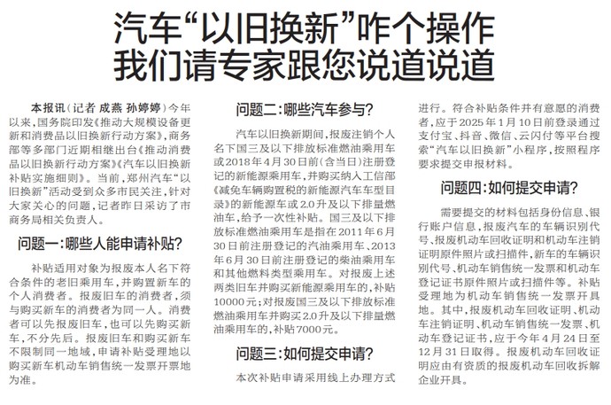 今年以来,国务院印发《推动大规模设备更新和消费品以旧换新行动方案》,商务部等多部门近期相继出台《推动消费品以旧换新行动方案》《汽车以旧换新补贴实施细则》。当前,郑州汽车“以旧换新”活动受到众多市民关注,针对大家关心的问题,记者昨日采访了市商务局相关负责人。(今日《郑州日报》2版)