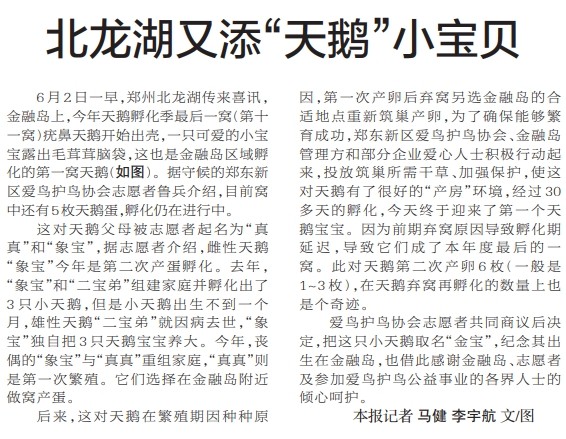 6月2日一早,郑州北龙湖传来喜讯,金融岛上,今年天鹅孵化季最后一窝(第十一窝)疣鼻天鹅开始出壳,一只可爱的小宝宝露出毛茸茸脑袋,这也是金融岛区域孵化的第一窝天鹅。据守候的郑东新区爱鸟护鸟协会志愿者鲁兵介绍,目前窝中还有5枚天鹅蛋,孵化仍在进行中。(今日《郑州日报》2版)