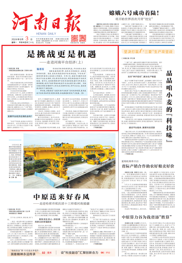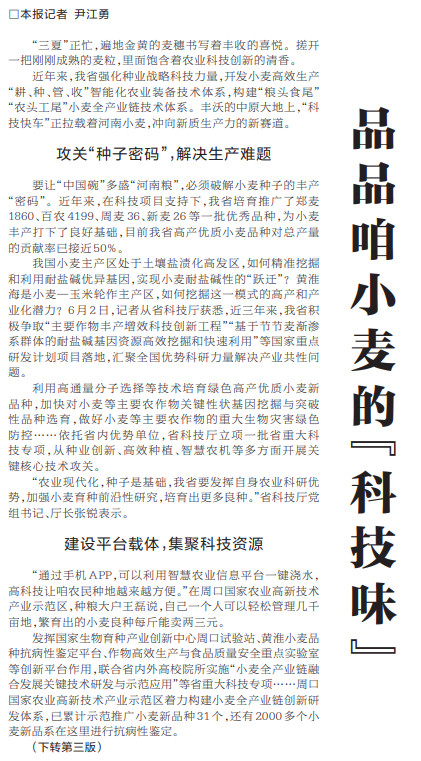 近年来,我省强化种业战略科技力量,开发小麦高效生产“耕、种、管、收”智能化农业装备技术体系,构建“粮头食尾”“农头工尾”小麦全产业链技术体系。丰沃的中原大地上,“科技快车”正拉载着河南小麦,冲向新质生产力的新赛道。(今日《河南日报》1版、3版)