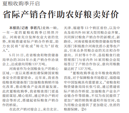 麦熟一晌,一年一度的夏粮收购季已悄然开启。河南省充分发挥农业大省的优势,积极搭建省际产销合作桥梁,助力农民将“好收成”转化为“好收入”。(今日《河南日报》1版)