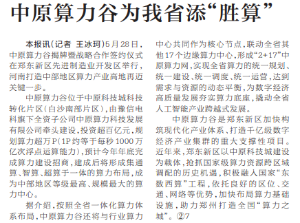 5月28日,中原算力谷揭牌暨战略合作签约仪式在郑东新区先进制造业开发区举行,河南打造中部地区算力产业高地再迈关键一步。(今日《河南日报》1版)