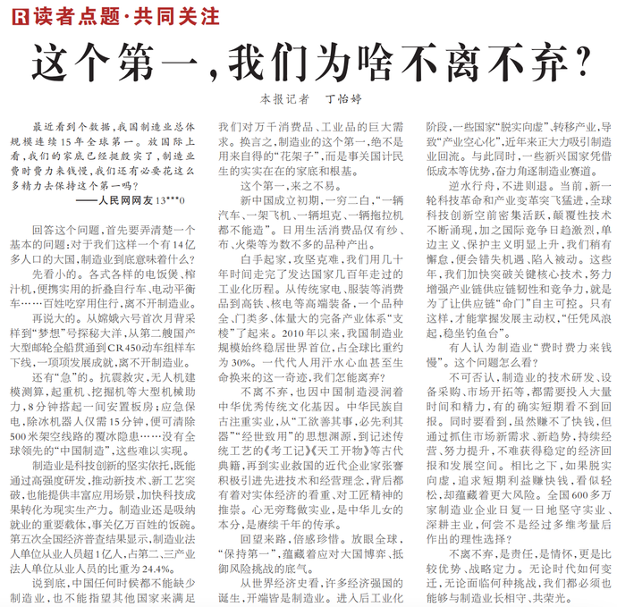 最近看到个数据,我国制造业总体规模连续15年全球第一。放国际上看,我们的家底已经挺殷实了,制造业费时费力来钱慢,我们还有必要花这么多精力去保持这个第一吗?