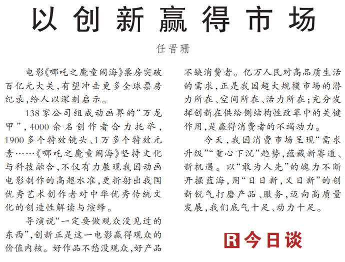 电影《哪吒之魔童闹海》票房突破百亿元大关,有望冲击更多全球票房纪录,给人以深刻启示。(今日《人民日报》1版)