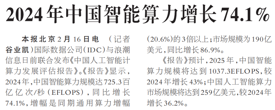 国际数据公司(IDC)与浪潮信息日前联合发布《中国人工智能计算力发展评估报告》。《报告》显示,2024年,中国智能算力规模达725.3百亿亿次/秒(EFLOPS),同比增长74.1%,增幅是同期通用算力增幅(20.6%)的3倍以上;市场规模为190亿美元,同比增长86.9%。(今日《人民日报》1版)