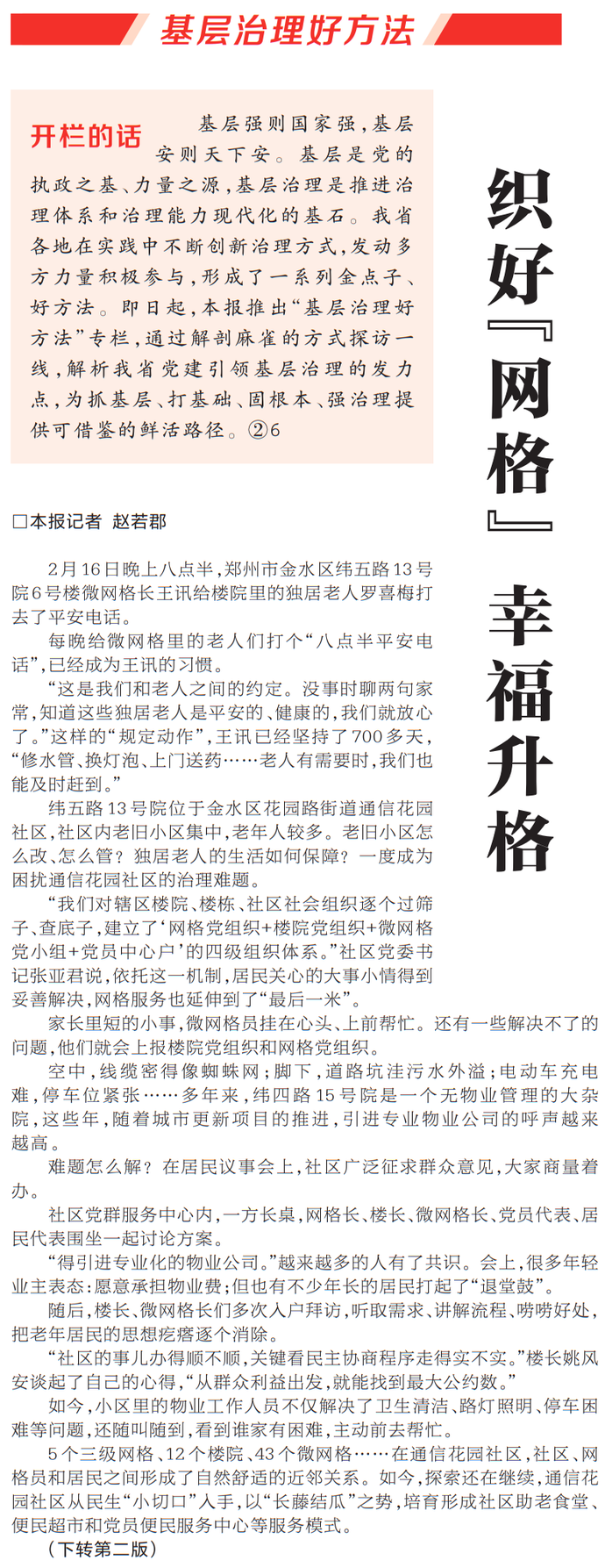 基层强则国家强,基层安则天下安。基层是党的执政之基、力量之源,基层治理是推进治理体系和治理能力现代化的基石。我省各地在实践中不断创新治理方式,发动多方力量积极参与,形成了一系列金点子、好方法。即日起,本报推出“基层治理好方法”专栏,通过解剖麻雀的方式探访一线,解析我省党建引领基层治理的发力点,为抓基层、打基础、固根本、强治理提供可借鉴的鲜活路径。