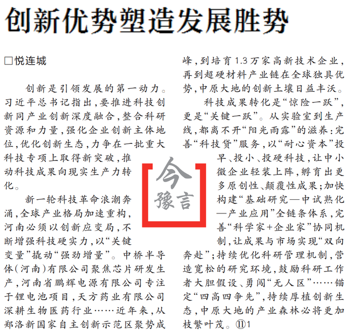创新是引领发展的第一动力。习近平总书记指出,要推进科技创新同产业创新深度融合,整合科研资源和力量,强化企业创新主体地位,优化创新生态,力争在一批重大科技专项上取得新突破,推动科技成果向现实生产力转化。(今日《河南日报》1版)