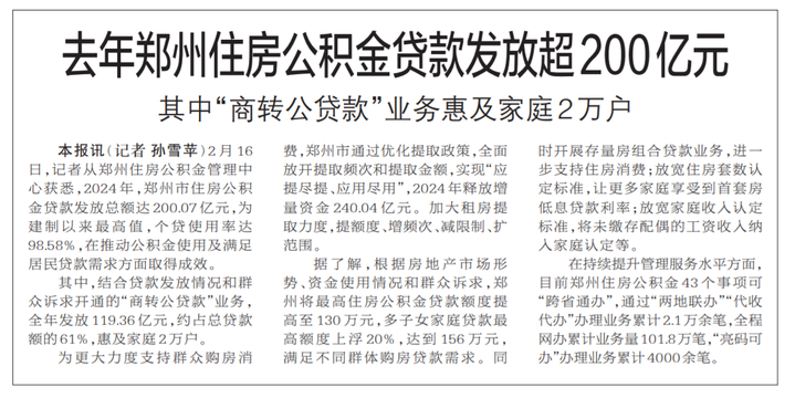 2月16日,记者从郑州住房公积金管理中心获悉,2024年,郑州市住房公积金贷款发放总额达200.07亿元,为建制以来最高值,个贷使用率达98.58%,在推动公积金使用及满足居民贷款需求方面取得成效。(今日《郑州日报》1版)