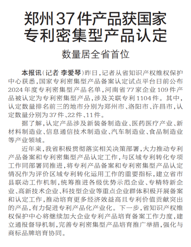 郑州37件产品获国家专利密集型产品认定