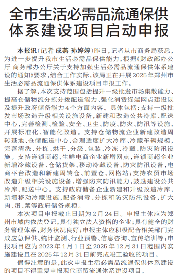 昨日,记者从市商务局获悉,为进一步提升我市生活必需品保供能力,根据《财政部办公厅 商务部办公厅关于支持加强生活必需品流通保供体系建设的通知》要求,结合工作实际,该局正在开展2025年郑州市生活必需品流通保供体系建设项目申报工作。(今日《郑州日报》1版)