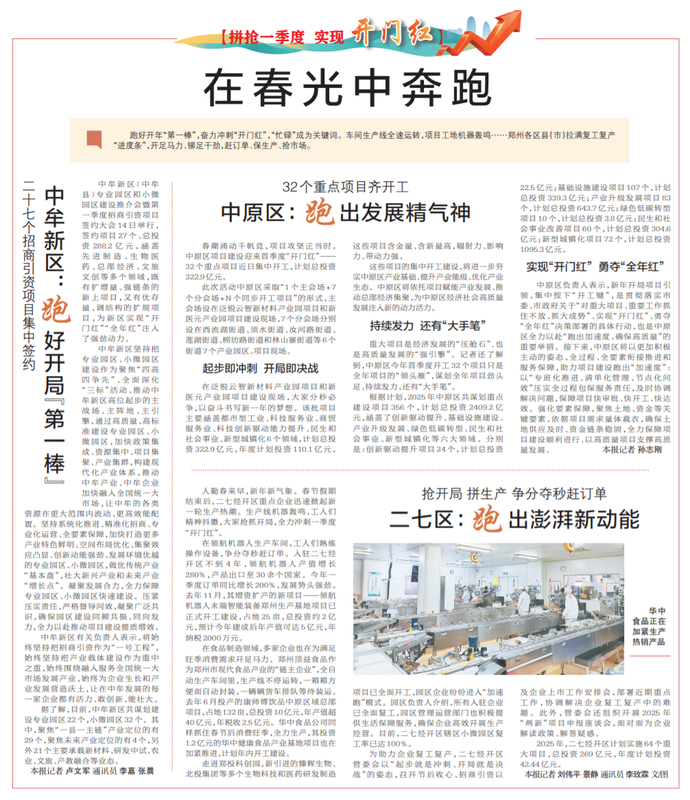 春潮涌动千帆竞,项目攻坚正当时。中原区项目建设迎来首季度“开门红”——32个重点项目近日集中开工,计划总投资322.9亿元。(今日《郑州日报》1版)