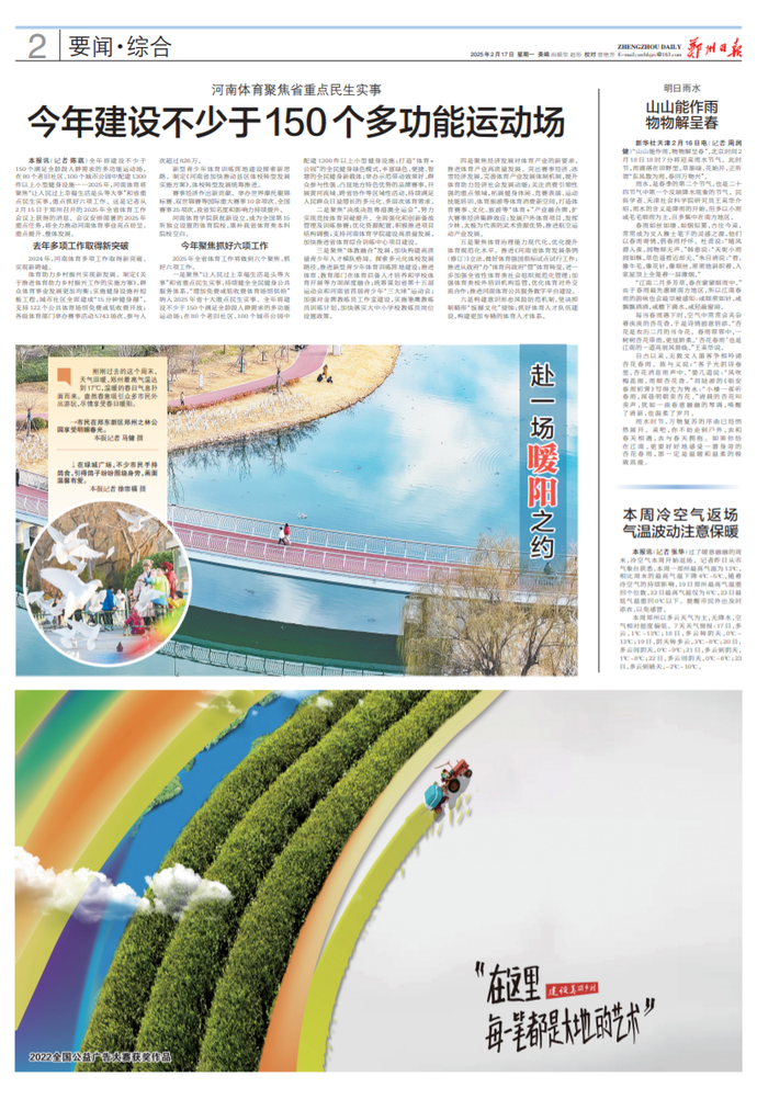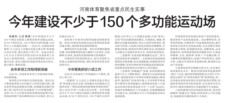 全年将建设不少于150个满足全龄段人群需求的多功能运动场,在80个老旧社区、100个城市公园中配建1300件以上小型健身设施……2025年,河南体育将聚焦“让人民过上幸福生活是头等大事”和省重点民生实事,重点抓好六项工作。这是记者从2月15日于郑州召开的2025年全省体育工作会议上获得的消息。会议安排部署的2025年重点任务,将全力推动河南体育事业亮点纷呈、重点提升、整体发展。(今日《郑州日报》2版)