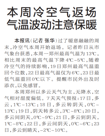 过了暖意融融的周末,冷空气本周开始返场。记者昨日从市气象台获悉,本周一郑州最高气温为13℃,相比周末的最高气温下降4℃~5℃,随着冷空气的持续影响,19日郑州最高气温重回个位数,22日最高气温仅为6℃,23日最低气温重回0℃以下。提醒市民外出及时添衣,以免感冒。(今日《郑州日报》2版)