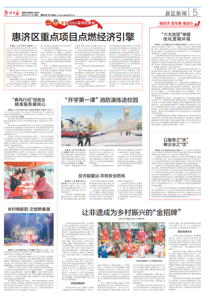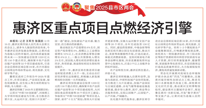 2月15日,惠济区第四届人民代表大会第五次会议上,诸多令人振奋的消息传来,今年惠济区经济发展态势强劲,让黄河成为造福人民的幸福河,迈向高质量发展的未来——加快建设总投资1220亿元的116个重点项目,确保聚丰农产品供应链产业园等32个项目建成投用,引进企业总部和区域总部34家,在汴河遗址公园周边布局冰雪运动、观光旅游、文化研学等产业。(今日《郑州日报》5版)