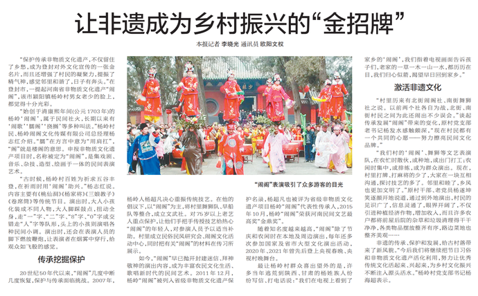 “保护传承非物质文化遗产,不仅留住了乡愁,成为登封对外文化宣传的一张金名片,而且还增强了村民的凝聚力,提振了精气神,感觉邻里和谐了,日子有奔头。”在登封市,一提起河南省非物质文化遗产“闹阁”,该市颍阳镇杨岭村男女老少的脸上,都觉得十分光彩。(今日《郑州日报》5版)