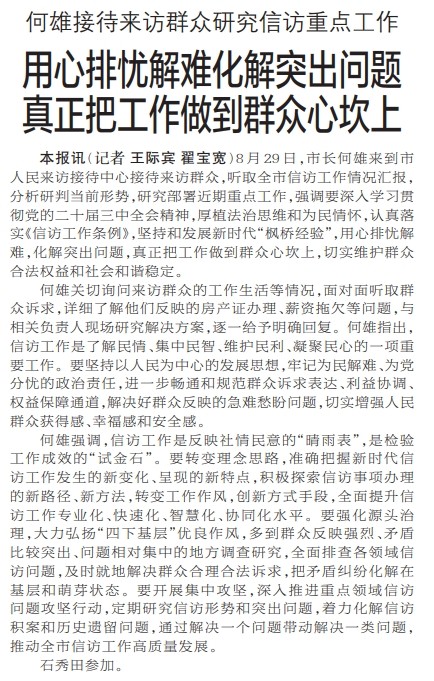 8月29日,市长何雄来到市人民来访接待中心接待来访群众,听取全市信访工作情况汇报,分析研判当前形势,研究部署近期重点工作,强调要深入学习贯彻党的二十届三中全会精神,厚植法治思维和为民情怀,认真落实《信访工作条例》,坚持和发展新时代“枫桥经验”,用心排忧解难,化解突出问题,真正把工作做到群众心坎上,切实维护群众合法权益和社会和谐稳定。(今日《郑州日报》1版)