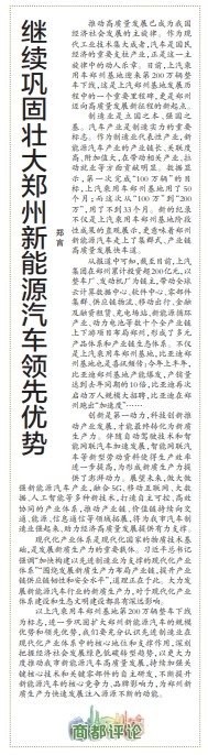 继续巩固壮大郑州新能源汽车领先优势
