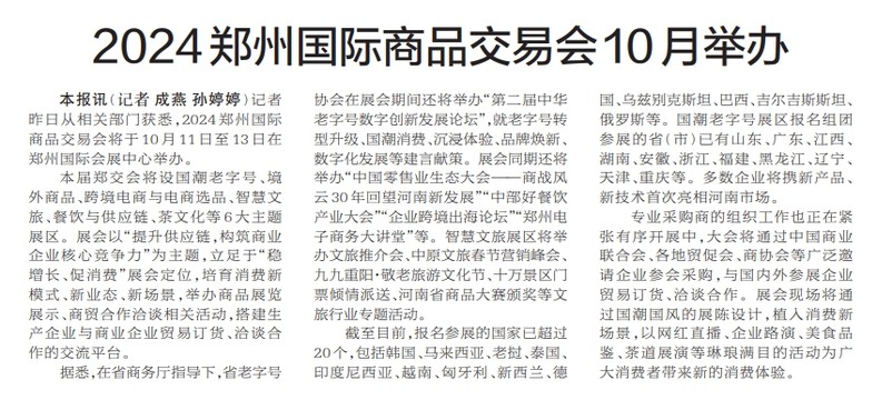 记者昨日从相关部门获悉,2024郑州国际商品交易会将于10月11日至13日在郑州国际会展中心举办。(今日《郑州日报》1版)