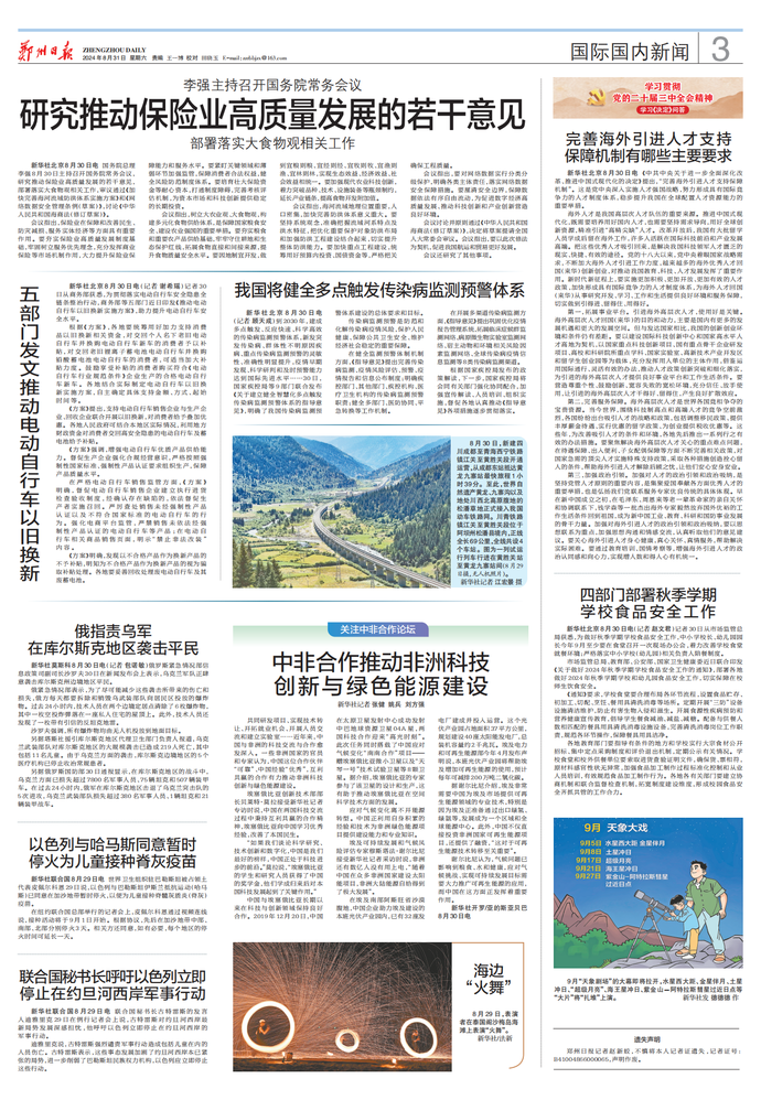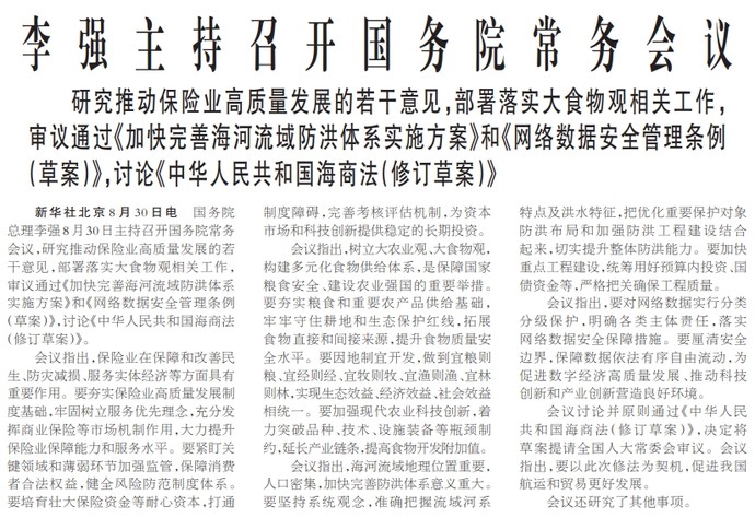 国务院总理李强8月30日主持召开国务院常务会议,研究推动保险业高质量发展的若干意见,部署落实大食物观相关工作,审议通过《加快完善海河流域防洪体系实施方案》和《网络数据安全管理条例(草案)》,讨论《中华人民共和国海商法(修订草案)》。(今日《人民日报》1版)