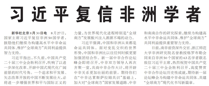 8月27日,国家主席习近平复信非洲50国学者,鼓励他们继续为构建高水平中非命运共同体、维护“全球南方”共同利益提供智力支持。