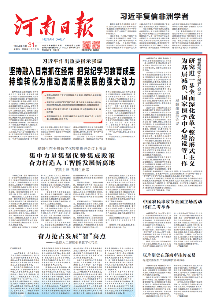 人工智能是新一轮科技革命和产业变革的重要驱动力量。8月30日,全省数字化转型推进会议召开。抢抓人工智能发展机遇,赋能中国式现代化建设河南实践,会议安排部署河南人工智能发展重要工作。(今日《河南日报》1版)