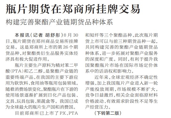 8月30日,瓶片期货在郑州商品交易所挂牌交易。这是郑商所上市的第26个期货品种,对聚酯类衍生品服务实体经济具有极大促进作用。(今日《河南日报》1版、2版)