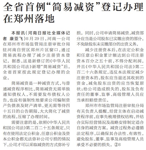 8月29日,河南一公司在郑州市市场监管局注册审批分局驻河南自贸区郑州片区窗口,通过简易流程办理了减少注册资本登记。据悉,这是新修订的《中华人民共和国公司法》新增“简易减资”后,全省首家按此规定登记办理的企业。(今日《河南日报》2版)