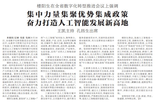 8月30日,全省数字化转型推进会议在郑州召开,认真学习贯彻习近平总书记关于发展人工智能的重要论述,就扎实推进以人工智能为引领的数字化转型进行安排部署,为推进中国式现代化建设河南实践打造战略支撑、注入强劲动能。省委书记楼阳生讲话,省长王凯主持,省政协主席孔昌生出席。(今日《河南日报》1版)