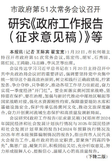 1月22日,市长何雄主持召开市政府第51次常务会议,陈宏伟、胡军、石秀田、陈红民、王鸿勋、马志峰、李凤芝等出席。(今日《郑州日报》1版、2版)