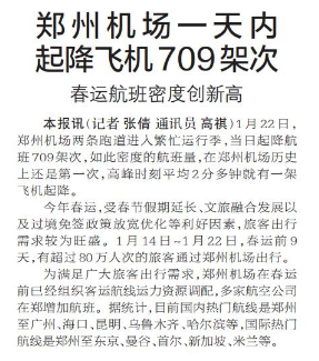 1月22日,郑州机场两条跑道进入繁忙运行季,当日起降航班709架次,如此密度的航班量,在郑州机场历史上还是第一次,高峰时刻平均2分多钟就有一架飞机起降。(今日《郑州日报》2版)