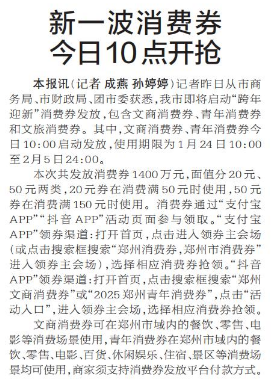 记者昨日从市商务局、市财政局、团市委获悉,我市即将启动“跨年迎新”消费券发放,包含文商消费券、青年消费券和文旅消费券。其中,文商消费券、青年消费券今日10:00启动发放,使用期限为1月24日10:00至2月5日24:00。(今日《郑州日报》2版)