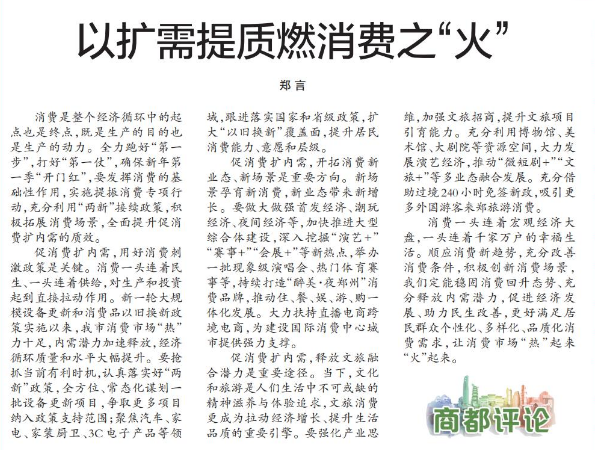消费是整个经济循环中的起点也是终点,既是生产的目的也是生产的动力。全力跑好“第一步”,打好“第一仗”,确保新年第一季“开门红”,要发挥消费的基础性作用,实施提振消费专项行动,充分利用“两新”接续政策,积极拓展消费场景,全面提升促消费扩内需的质效。(今日《郑州日报》2版)
