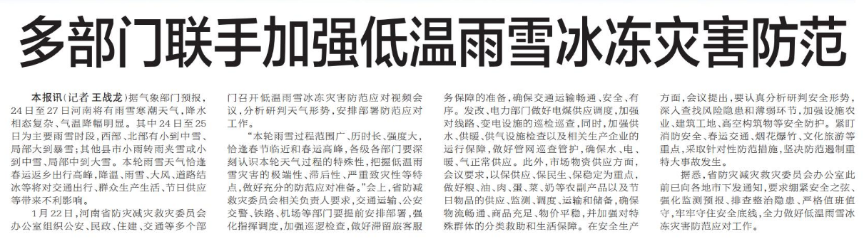 据气象部门预报,24日至27日河南将有雨雪寒潮天气,降水相态复杂、气温降幅明显。其中24日至25日为主要雨雪时段,西部、北部有小到中雪、局部大到暴雪;其他县市小雨转雨夹雪或小到中雪、局部中到大雪。本轮雨雪天气恰逢春运返乡出行高峰,降温、雨雪、大风、道路结冰等将对交通出行、群众生产生活、节日供应等带来不利影响。(今日《郑州日报》3版)
