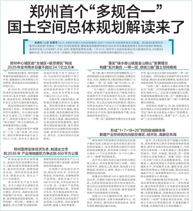 近日,《郑州市国土空间总体规划(2021—2035年)》由国务院正式批复。该《规划》是郑州市建市以来首部“多规合一”国土空间总体规划,整体谋划构建郑州面向2035年中长期发展的国土空间开发保护新格局,是郑州市国土空间保护、开发、利用、修复的政策和总纲。1月23日,郑州市人民政府新闻办召开新闻发布会,对《规划》编制内容、特点及意义作进一步解读,并就郑州如何迈向2035年新格局等问题回应公众关切。(今日《郑州日报》5版)