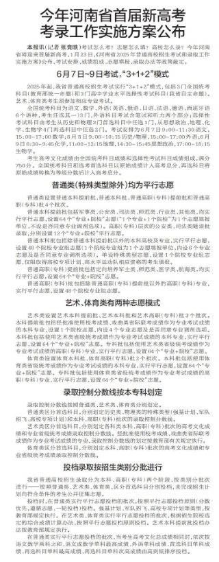 考试怎么考?志愿怎么填?高校怎么录?今年河南省将迎来首届新高考,1月23日,《河南省2025年普通高校招生考试和录取工作实施方案》公布,考试安排、成绩组成、志愿填报、录取办法等政策敲定。(今日《郑州日报》5版)