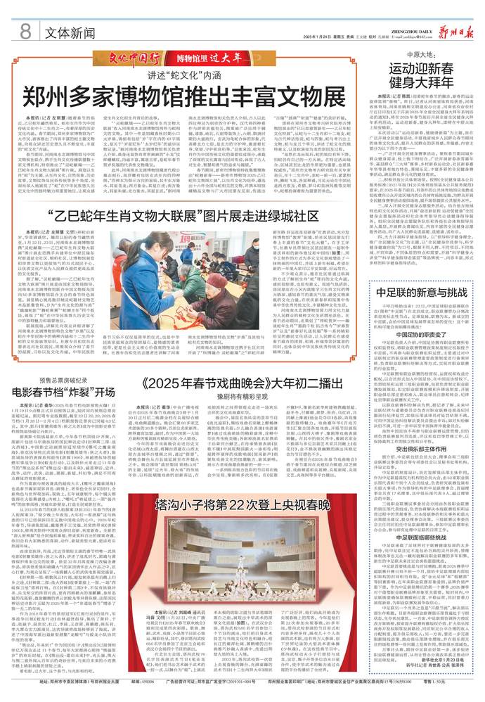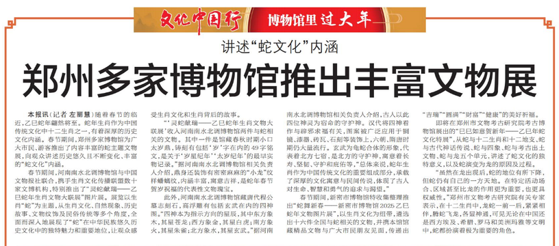 随着春节的临近,乙巳蛇年翩然将至。蛇年生肖作为中国传统文化中十二生肖之一,有着深厚的历史文化内涵。春节期间,郑州多家博物馆为广大市民、游客推出了内容丰富的蛇主题文物展,向观众讲述历史悠久且不断变化、丰富的“蛇文化”内涵。(今日《郑州日报》8版)