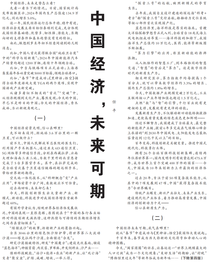 这一年,国民经济运行总体平稳、稳中有进,经济社会发展主要目标任务顺利完成,充分体现我国经济基础稳、优势多、韧性强、潜能大,长期向好的支撑条件和基本趋势没有变的特征。(今日《人民日报》1版、4版)