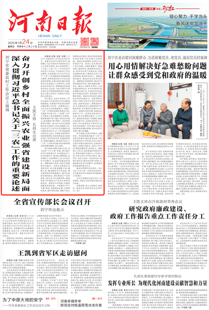 1月23日,省委农村工作会议在郑州召开。省委书记刘宁出席并讲话,强调要以习近平新时代中国特色社会主义思想为指导,深入贯彻党的二十大和二十届二中、三中全会及中央经济工作会议、中央农村工作会议精神,全面贯彻习近平总书记关于“三农”工作的重要论述和重要指示精神,按照省委经济工作会议和省两会部署,在推动城乡融合发展和乡村全面振兴上奋勇争先,加快农业农村现代化,朝着建设农业强省目标扎实迈进,为奋力谱写中国式现代化河南篇章提供坚实支撑。省长王凯主持会议,省政协主席孔昌生出席会议。(今日《河南日报》1版)
