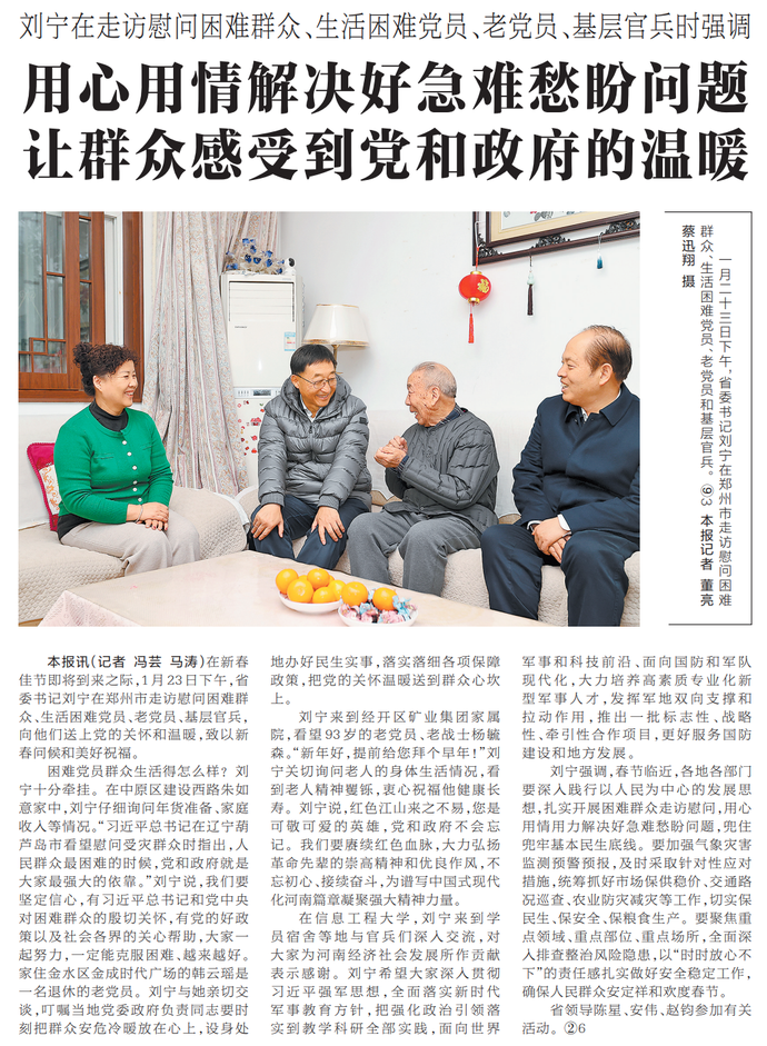 在新春佳节即将到来之际,1月23日下午,省委书记刘宁在郑州市走访慰问困难群众、生活困难党员、老党员、基层官兵,向他们送上党的关怀和温暖,致以新春问候和美好祝福。(今日《河南日报》1版)