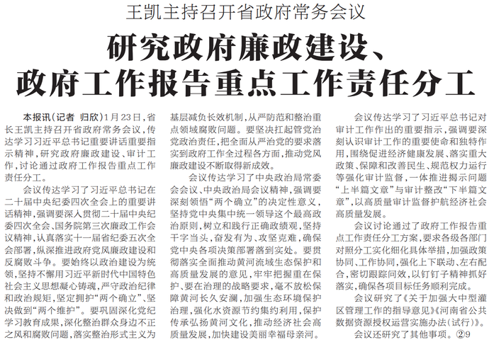 1月23日,省长王凯主持召开省政府常务会议,传达学习习近平总书记重要讲话重要指示精神,研究政府廉政建设、审计工作,讨论通过政府工作报告重点工作责任分工。(今日《河南日报》1版)