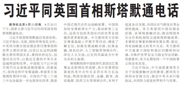 8月23日下午,国家主席习近平应约同英国首相斯塔默通电话。