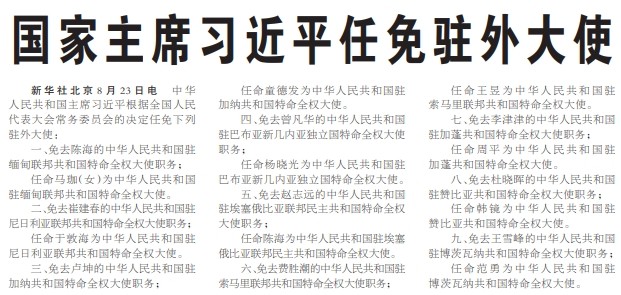 中华人民共和国主席习近平根据全国人民代表大会常务委员会的决定任免下列驻外大使: