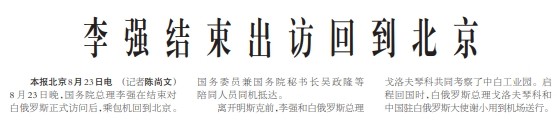 8月23日晚,国务院总理李强在结束对白俄罗斯正式访问后,乘包机回到北京。国务委员兼国务院秘书长吴政隆等陪同人员同机抵达。(今日《人民日报》1版)