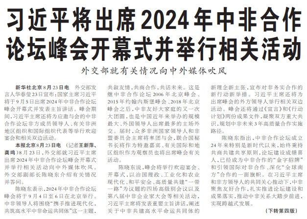 外交部发言人华春莹23日宣布:国家主席习近平将于9月5日出席2024年中非合作论坛峰会开幕式并发表主旨讲话。峰会期间,习近平主席还将为应邀与会的中非合作论坛非方成员领导人、有关非洲地区组织和国际组织代表等举行欢迎宴会和相关双边活动。(今日《人民日报》1版、4版)