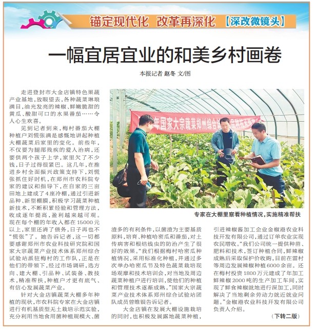 走进登封市大金店镇特色果蔬产业基地,放眼望去,各种蔬菜琳琅满目,油光发亮的辣椒、鲜嫩脆甜的黄瓜、酸甜可口的水果番茄……令人心生欢喜。(今日《郑州日报》1版、2版)